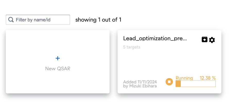After setting the thresholds, click Save. Go back to the QSAR tab and the newly created predictor should appear on this page. Click on Run to train the models. Once completed the progress bar will turn green, and two new buttons Test and See Results will appear.