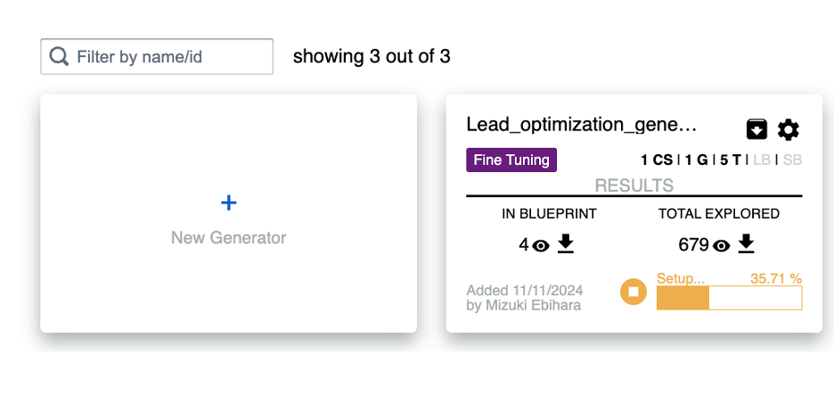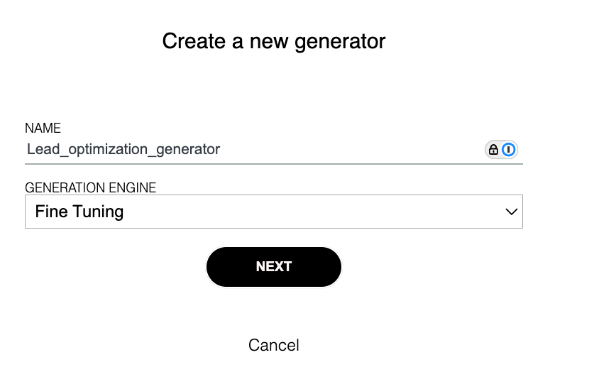 Step 3: Finally, to generate molecules guided by the QSAR model, go to the "Generators" tab of the project page and click on the New Generator box. Name the generator as “Lead_optimization_generator”, and under "Generation Engine" select Fine Tuning and click on Next.