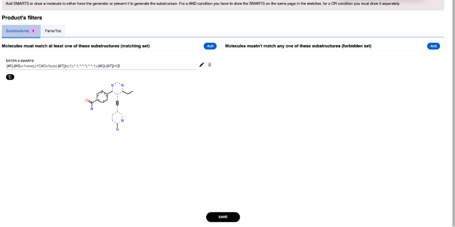 Products: In the "Substructures" tab, click the Add button on "Molecules must match at least one of these substructures (matching set)" enter the following SMARTS string and click Save: