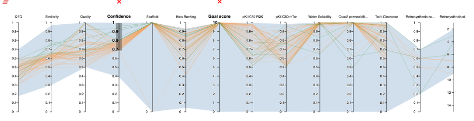 Step 4: While the generation is still running, visualize the generated molecules that match the specified blueprint by clicking on the eye icon under IN BLUEPRINT. On the page that appears, go to the Parallel Coordinates panel and adjust the Confidence metric to >0.7 by holding down the mouse on this metric and dragging it down to 0.7 as shown in the image below.