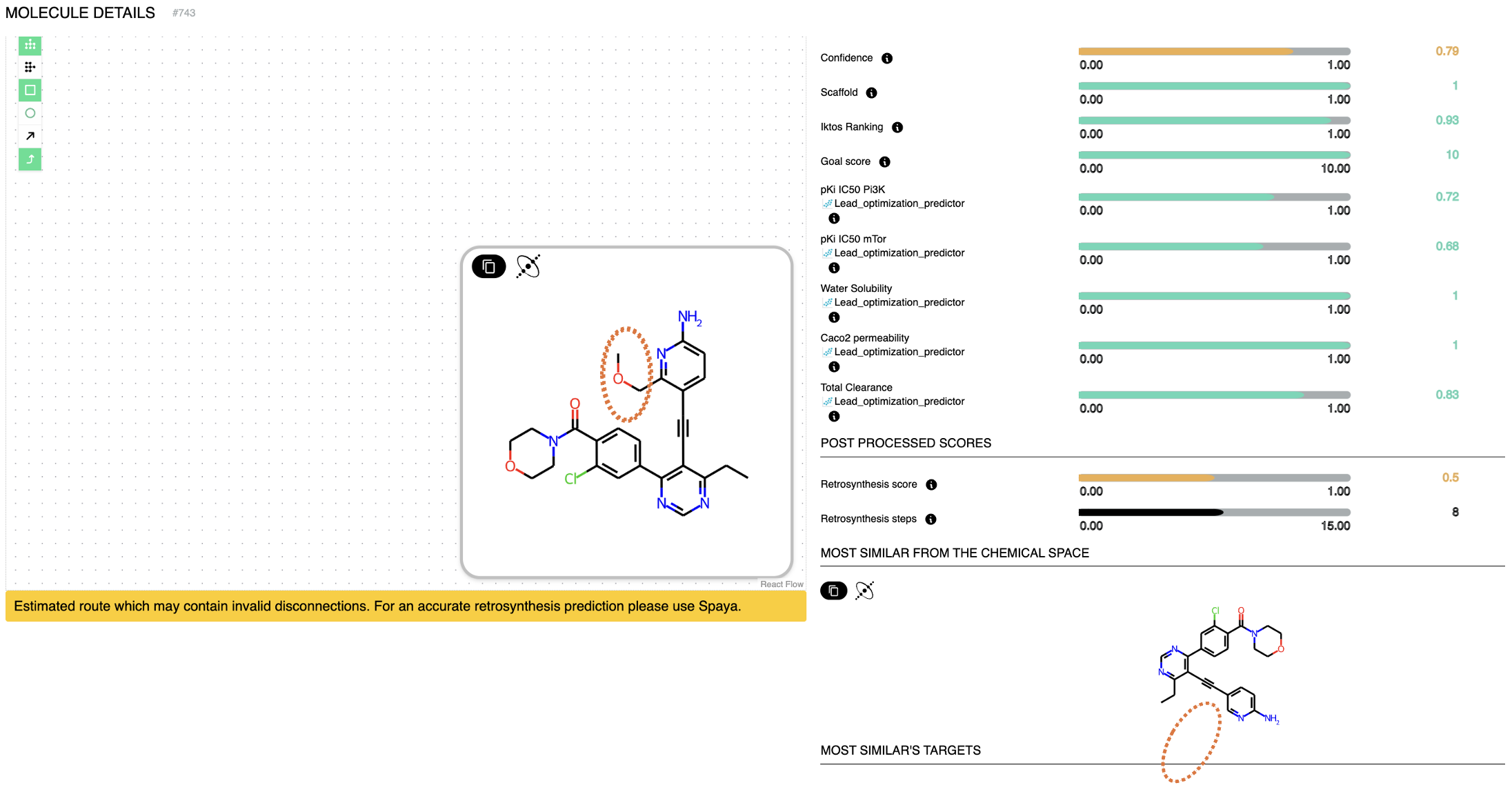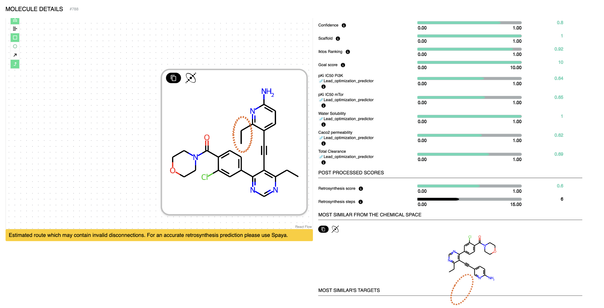 Sort the generated molecules by Iktos Ranking. On the first molecule of the generated molecules grid, click on See Details. In the window that pops up, compare the generated molecule with the molecule most similar to it from the chemical space, and notice the subtle differences between the two (see example images below). Also note the predicted values for all the objectives for the generated molecule in this window. Such analysis can be done for all the molecules that are generated.