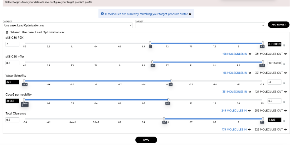 A number of sliders corresponding to each of the objectives (in the initial dataset) will appear on the screen. Use these sliders to define the thresholds for each objective while ensuring that there is always a balanced number of molecules that fall in and out of the thresholds (indicated by Molecules In and Molecules Out). An alternative to using the sliders is directly entering the desired value in the min or max threshold box for each objective. For this example use case, set the following thresholds.