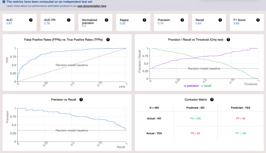 Clicking on the See Results button will display the ROC curves and associated metrics for each model trained on each objective. These can be used to assess the performance or quality of the trained models.